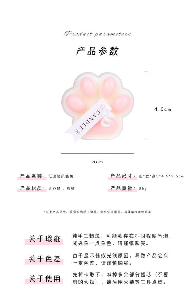 | 規格 | 粉色猫爪蠟燭, 紅色猫爪蠟燭, 黑色猫爪蠟燭 |